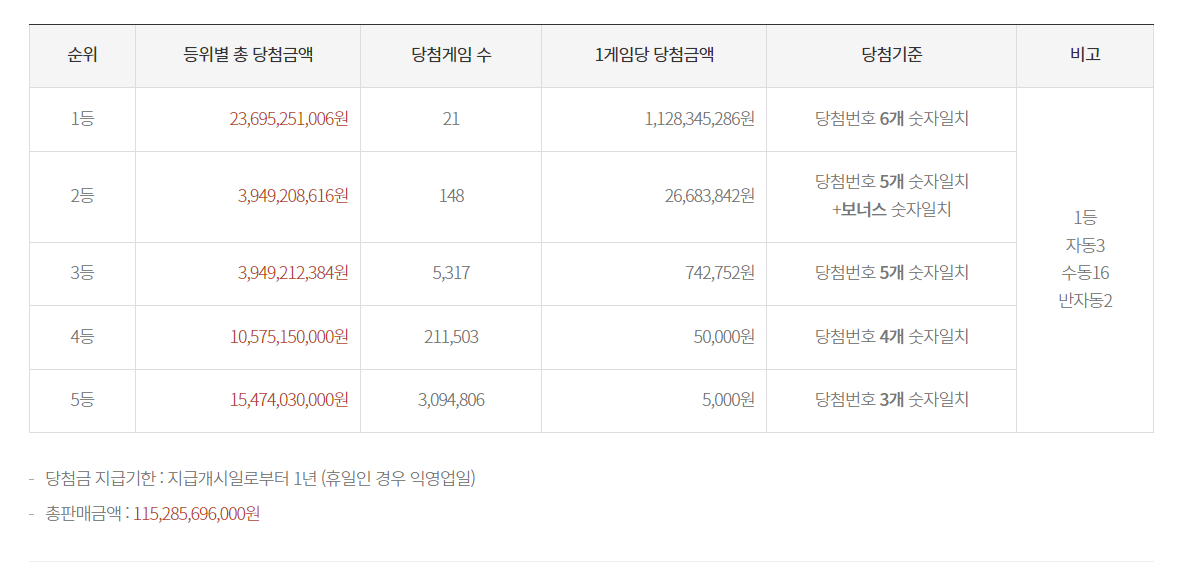 6개 번호를 모두 맞춘 1등 당첨자는 21명이다. 각각 11억 2834만 5286원을 받는다.