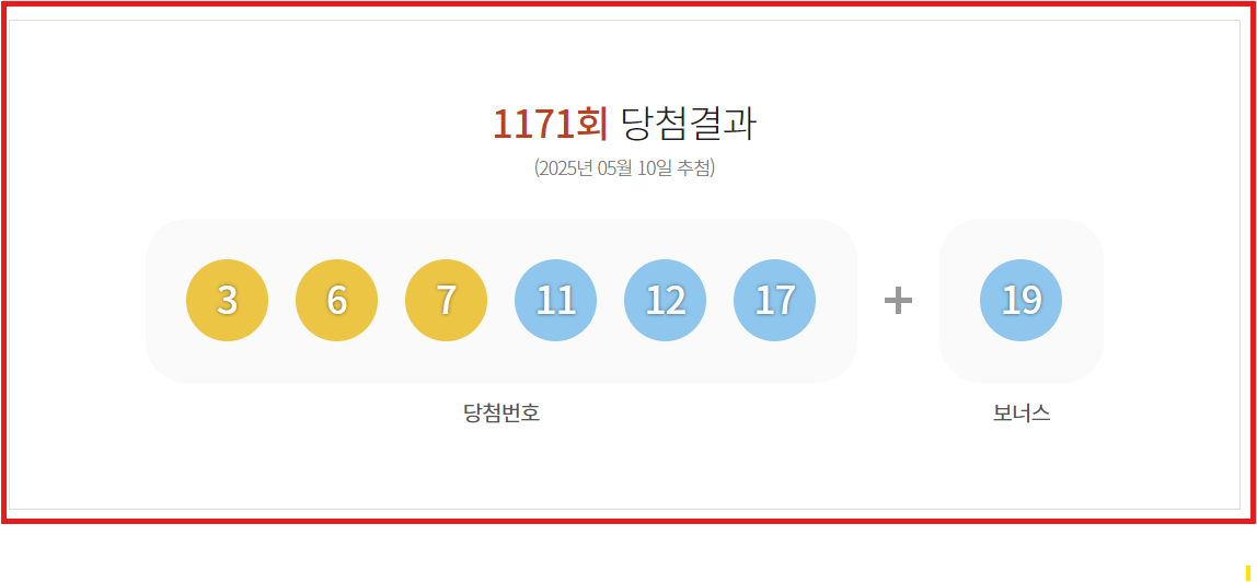 1171회 당첨결과 (2025년 05월 10일 추첨) 당첨번호 3 6 7 11 12 17 1171회 순위별 등위별 총 당첨금액, 당첨게임 수, 1게임당 당첨금액, 당첨기준, 비고 안내 순위 등위별 총 당첨금액 당첨게임 수 1게임당