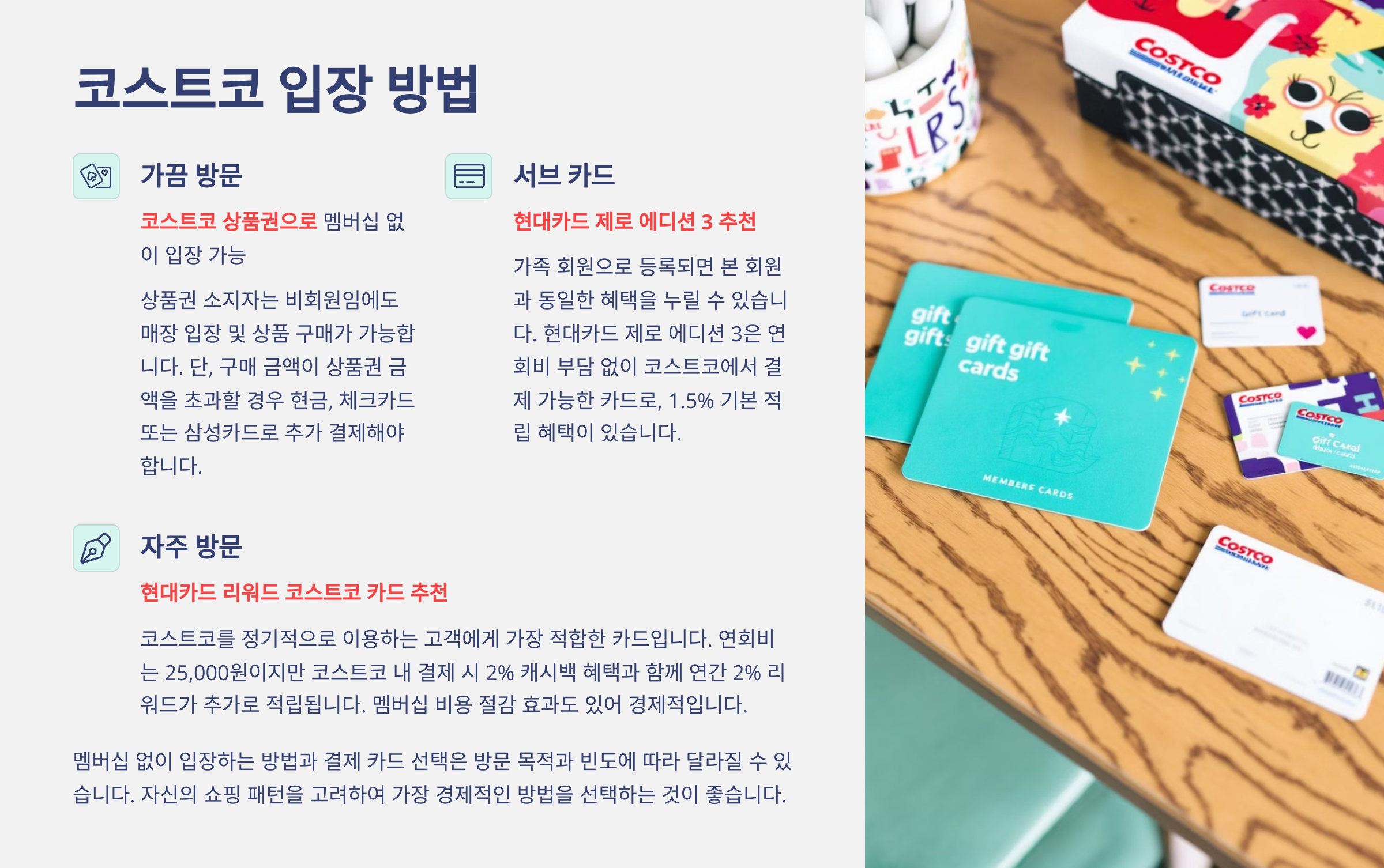 | 현대카드 제로 에디션 3 | 코스트코에서 사용 가능, 기본 할인 혜택 | 15,000원 |