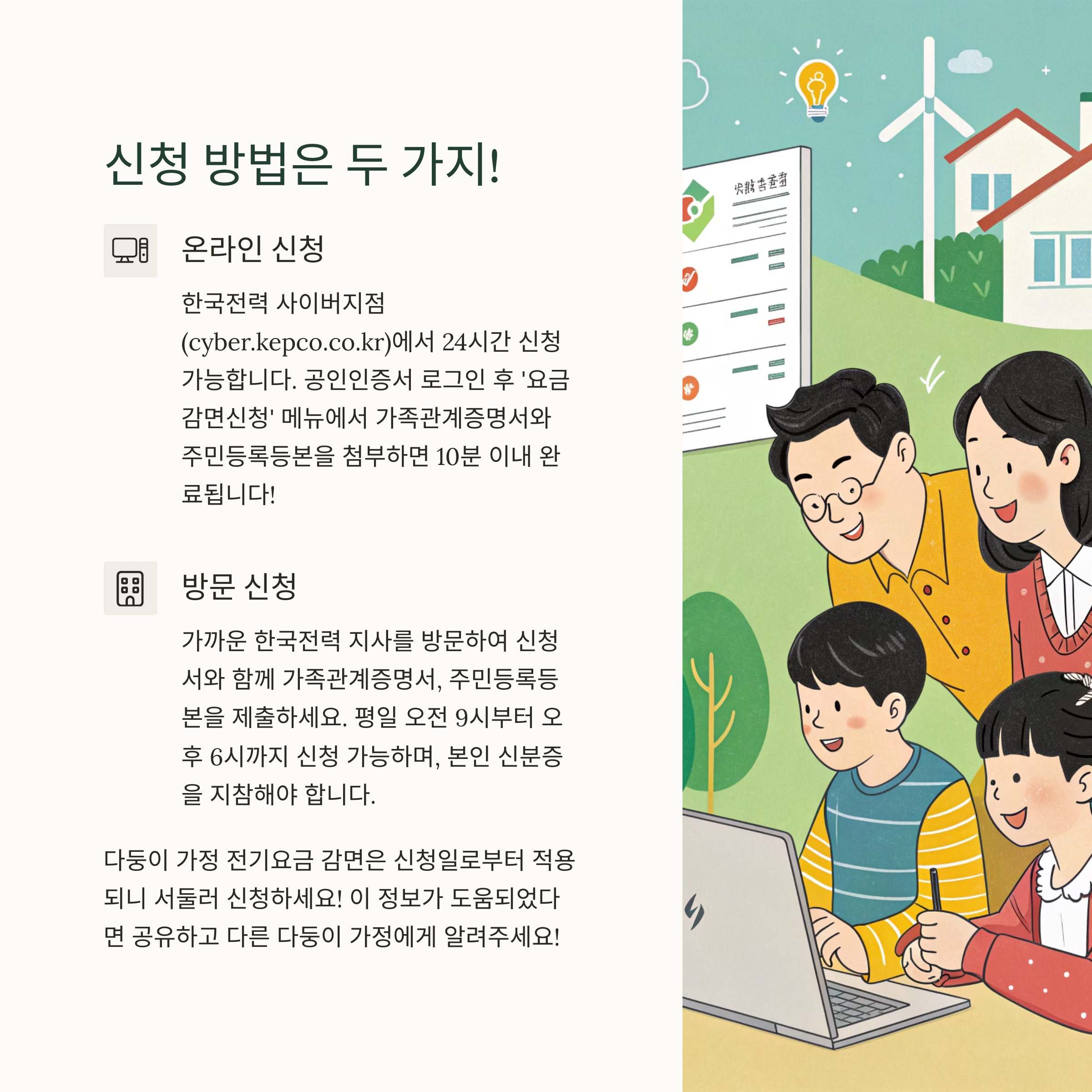 단, 자동으로 적용되는 것이 아니므로, 반드시 신청 절차를 거쳐야만 감면 혜택을 받을 수 있어요. 전기요금은 고정비 지출 중 하나인 만큼, 이런 제도를 적극적으로 활용하는 것이 정말 중요합니다 🙌