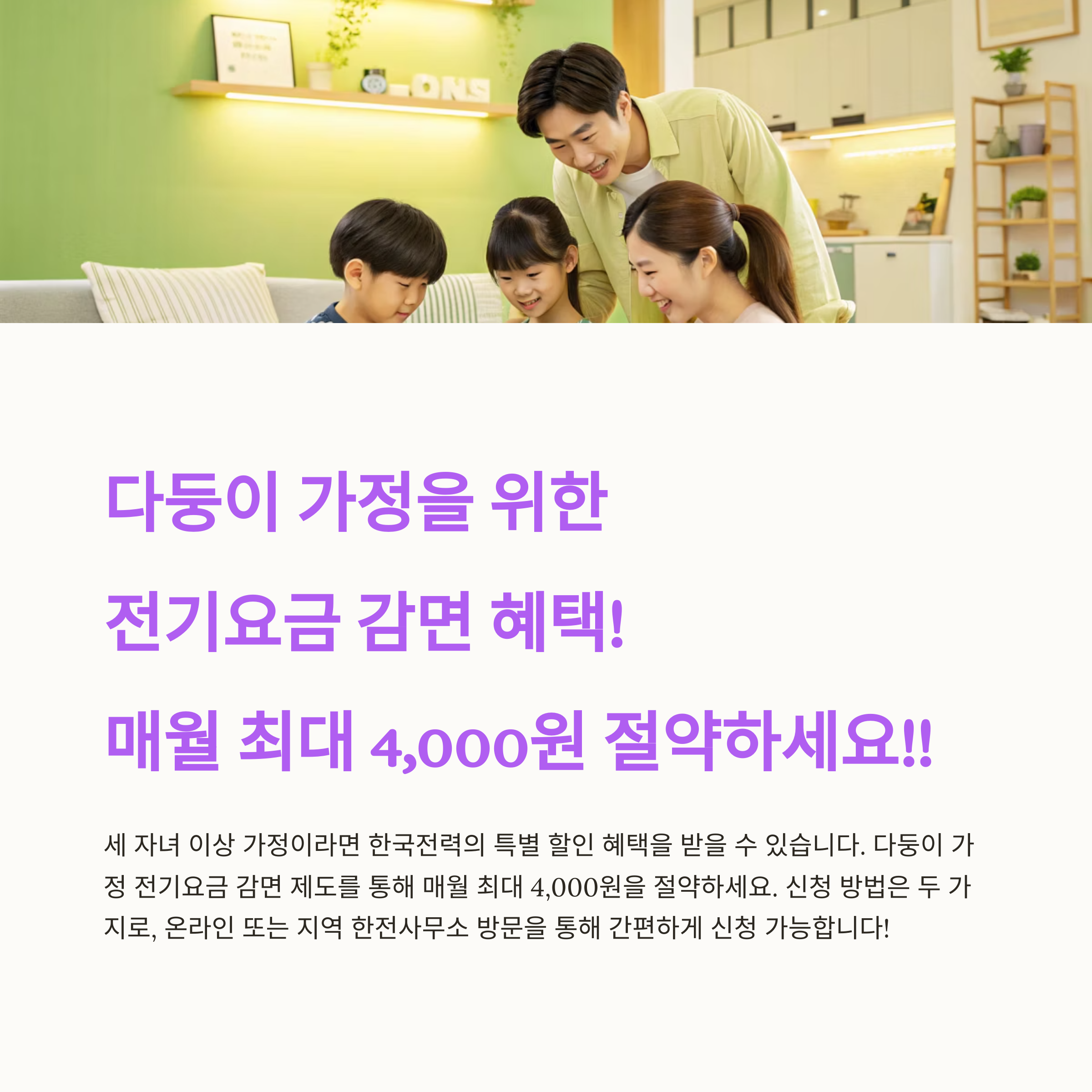 전기요금 감면 외에도 다둥이 가정이 받을 수 있는 혜택은 많아요!
