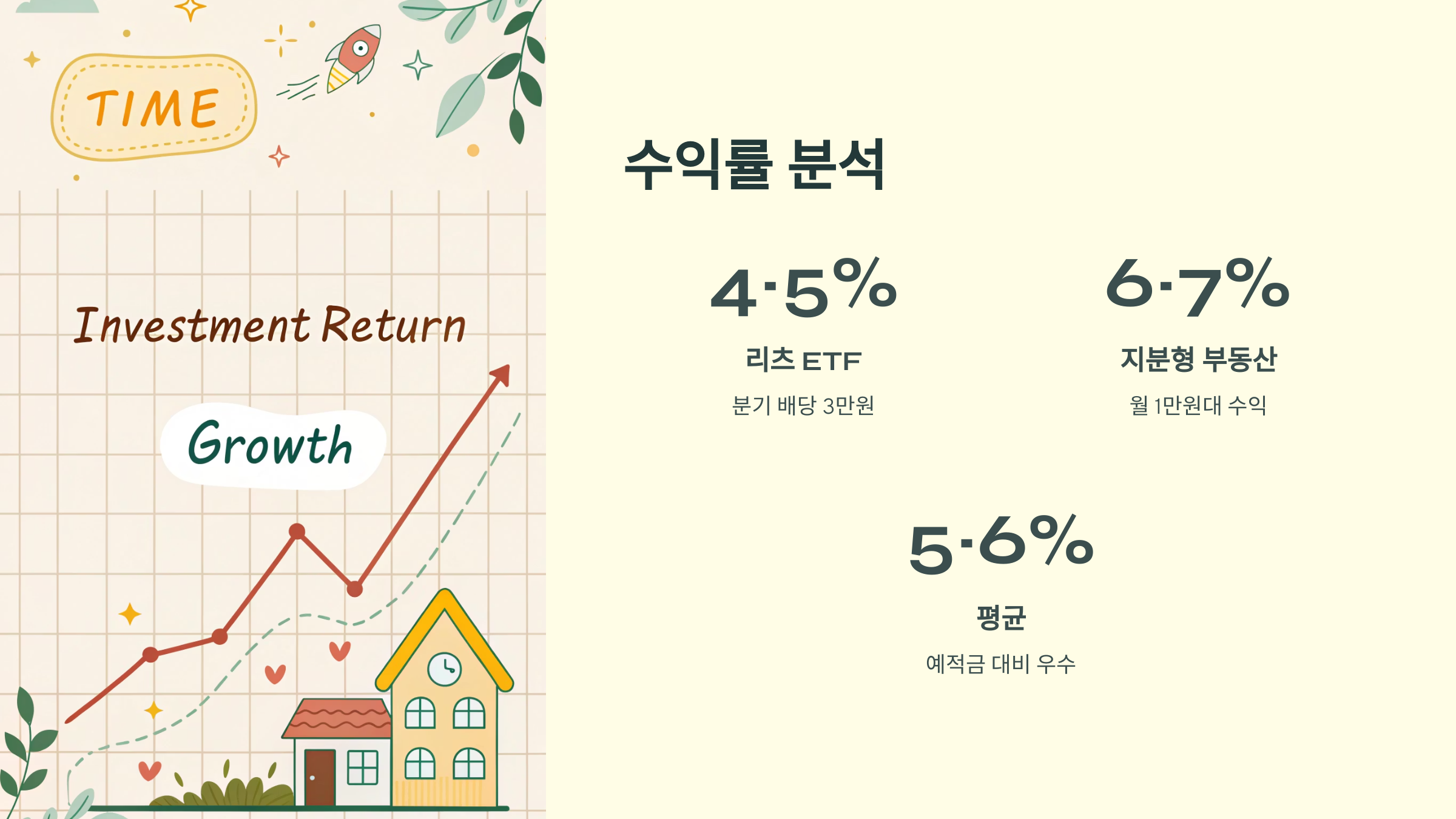 물론 기대 수익보다 낮을 수도 있지만, 장기적으로 보면 은행 예적금보다는 훨씬 높은 수익률이에요. 다만, 매매차익이 아닌 배당 위주라서 자산 증가보다는 현금흐름이 핵심이에요.